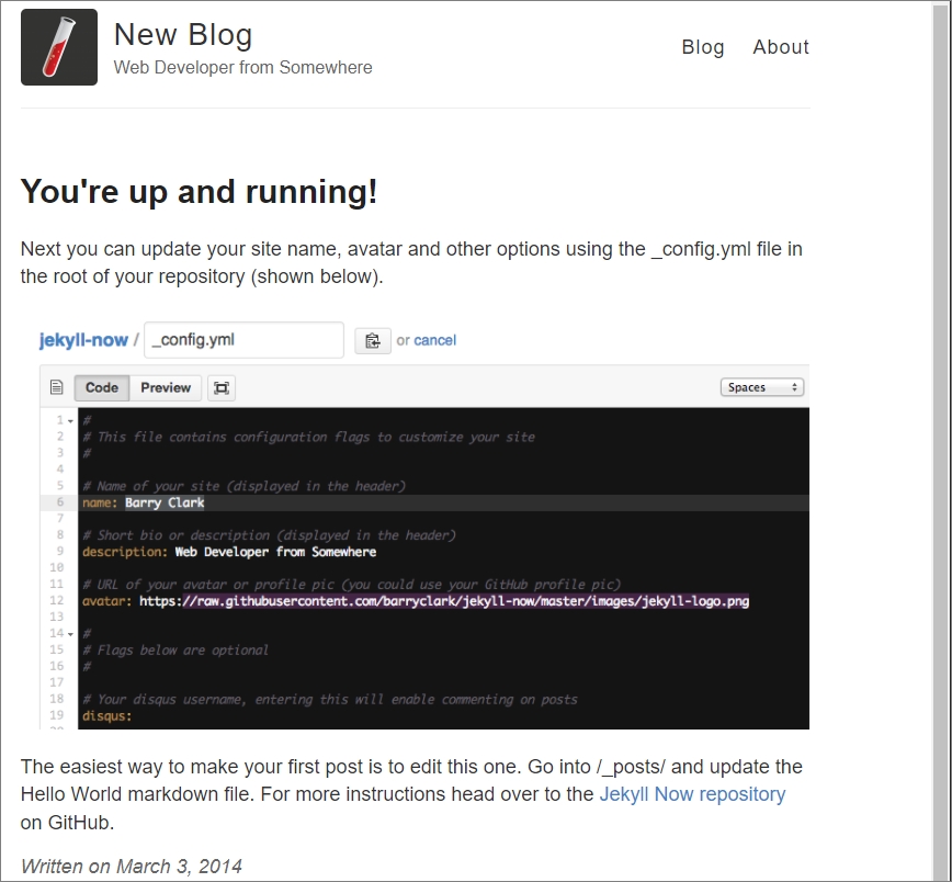 Next you can update your site name, avatar and other options using the _config.yml file in the root of your repository (shown below).