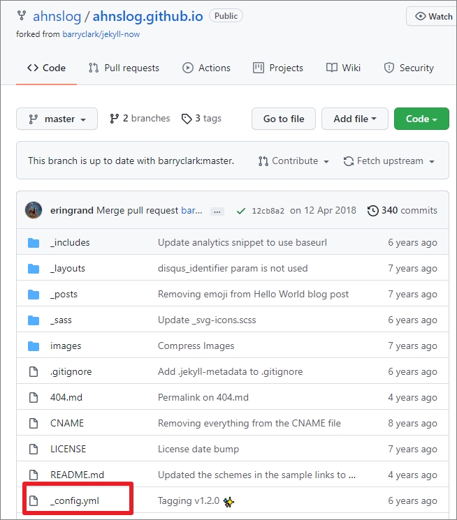 설정을 바꾸기 위해서는, 우리 저장소에 올라가 있는 코드를 수정해줘야 하는데요. 코드의 수정은 보통 로컬 PC 상에서 코드를 내려받고 수정하는 작업이 일반적입니다.(프로그램 개발의 경우) 하지만, 이 과정이 처음 하는 분들에게 조금은 어려울 수 있기 때문에, 로컬이 아닌 github 사이트에서 직접 수정을 해보도록 하겠습니다.