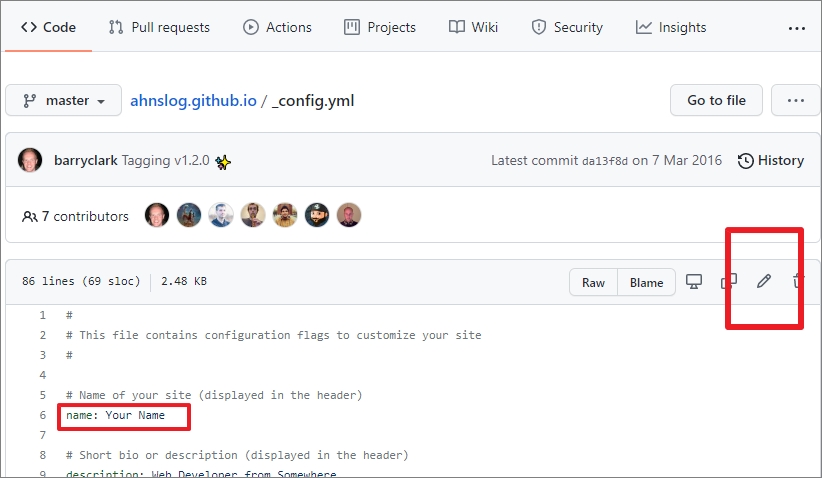 jekyll github 블로그의 세팅정보는 _config.yml 이라는 파일에 기록됩니다. 아래는 _config.yml 을 선택하여 수정모드로 진입한 상태입니다.