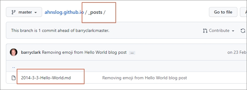 포스팅은 _posts 디렉토리에 파일을 만드는 것으로 진행이 됩니다. 아래처럼 _posts 경로에 들어가보면, 현재 2014-3-3-Hello-World.md 라는 파일이 샘플로 이미 만들어져 있고, 파일을 선택하면 내용을 볼 수 있습니다.