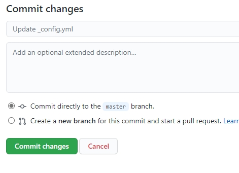 모두 수정한 뒤, 아래로 스크롤을 내리면, ‘Commit changes’라는 버튼을 볼 수 있는데, 이 버튼이 수정내용을 저장하는 버튼입니다. Commit 이라는 용어입니다.