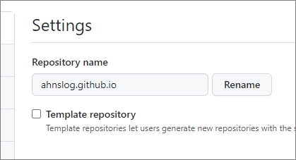 예제의 경우에서는, github에 가입한 아이디가 ‘ahnslog’입니다. 그리고 repository 이름은 ‘ahnslog.github.io’로 하였습니다. 이럴 경우, 최종 블로그 주소는 ‘https://ahnslog.github.io’가 됩니다. 하지만, repository 이름을 다르게 지정할 경우에는 https://ahnslog.github.io/{repository name} 이 되겠죠.