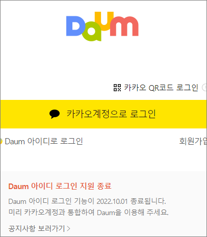 해당 통합 과정으로 인해, 다음 아이디 로그인은 2022년 10월 1일부로 종료가 된다고 공지가 되었습니다. 한메일에서 메일 기능들을 사용하려면, 카카오 계정통합을 수행해주세요.
